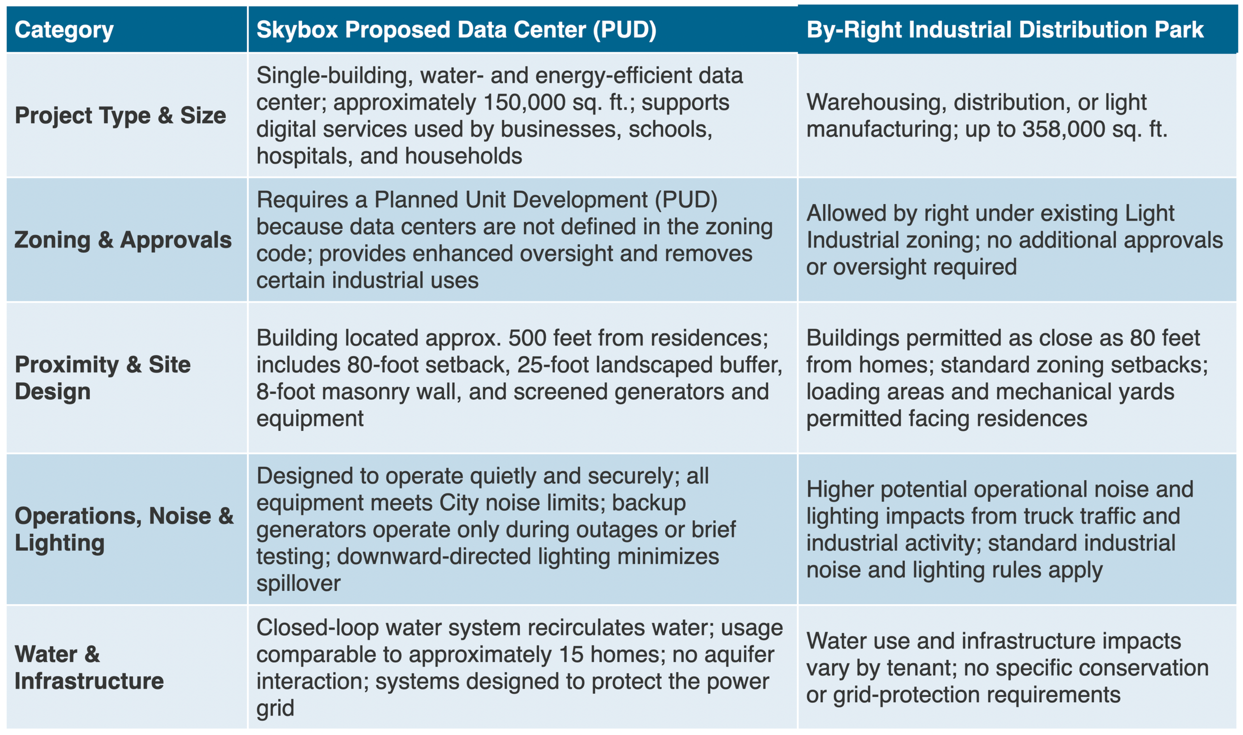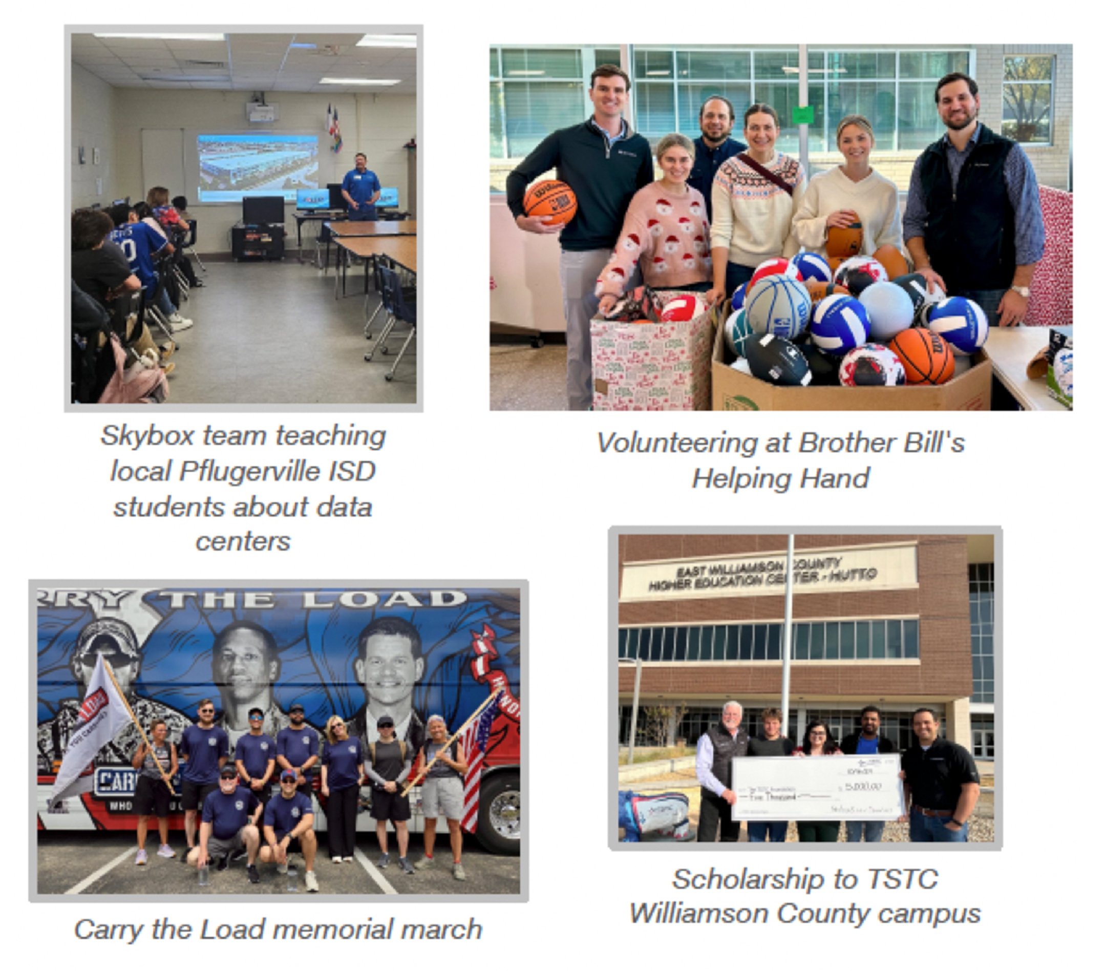 Skybox Datacenters is a Texas-founded and based company committed to responsible growth, environmental stewardship, and long-term community partnership. We design and build data centers to meet high standards of safety, efficiency, and reliability while respecting and strengthening surrounding communities. Our facilities in Hutto, Pflugerville, Dallas and other Texas communities demonstrate our ability to deliver high-quality projects that exceed typical light-industrial requirements. We work closely with city staff, elected officials, and residents to ensure our sites remain unobtrusive, compliant, and beneficial to the local tax base. Beyond our facilities, Skybox has been an engaged local partner, supporting public safety, economic development, and community initiatives identified by the cities we serve through both financial contributions and employee volunteer efforts. Our experienced operations team provides on-the-ground leadership and ongoing, transparent, community engagement.